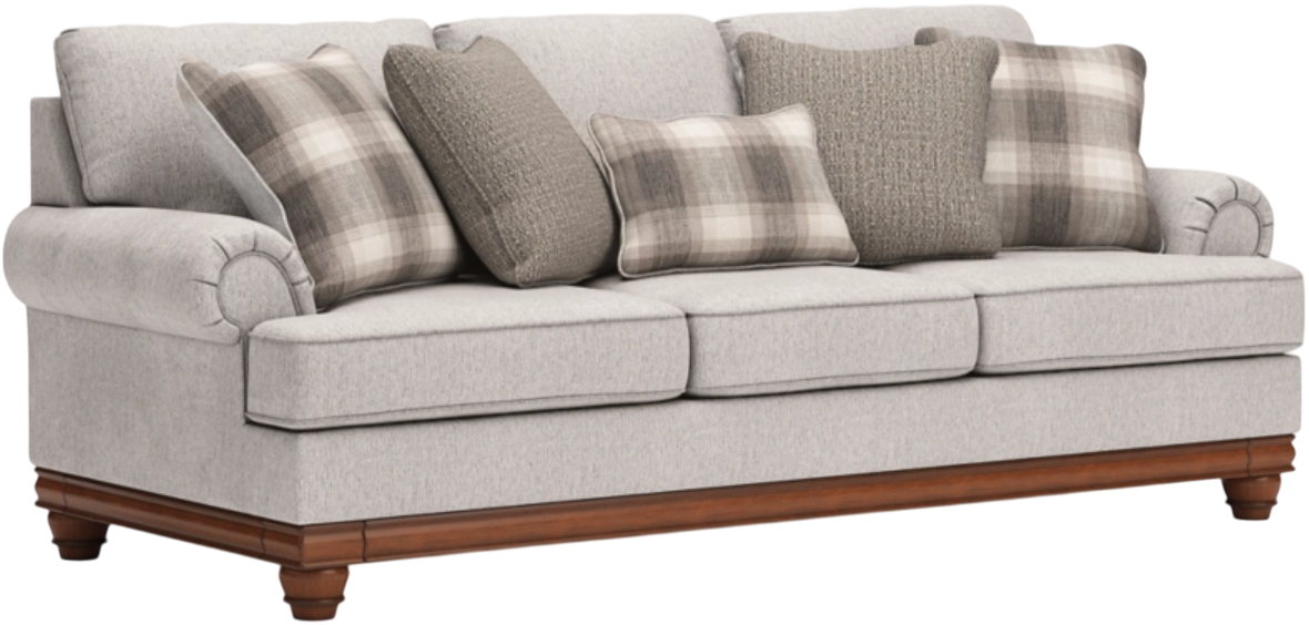Accent pillows in windowpane plaid and textured solid hues infuse a cozy and inviting farmhouse sensibility, while a full wraparound base and decorative turned legs complete the sofa's timeless look. It's the perfect place to unwind with your besties after a long day.